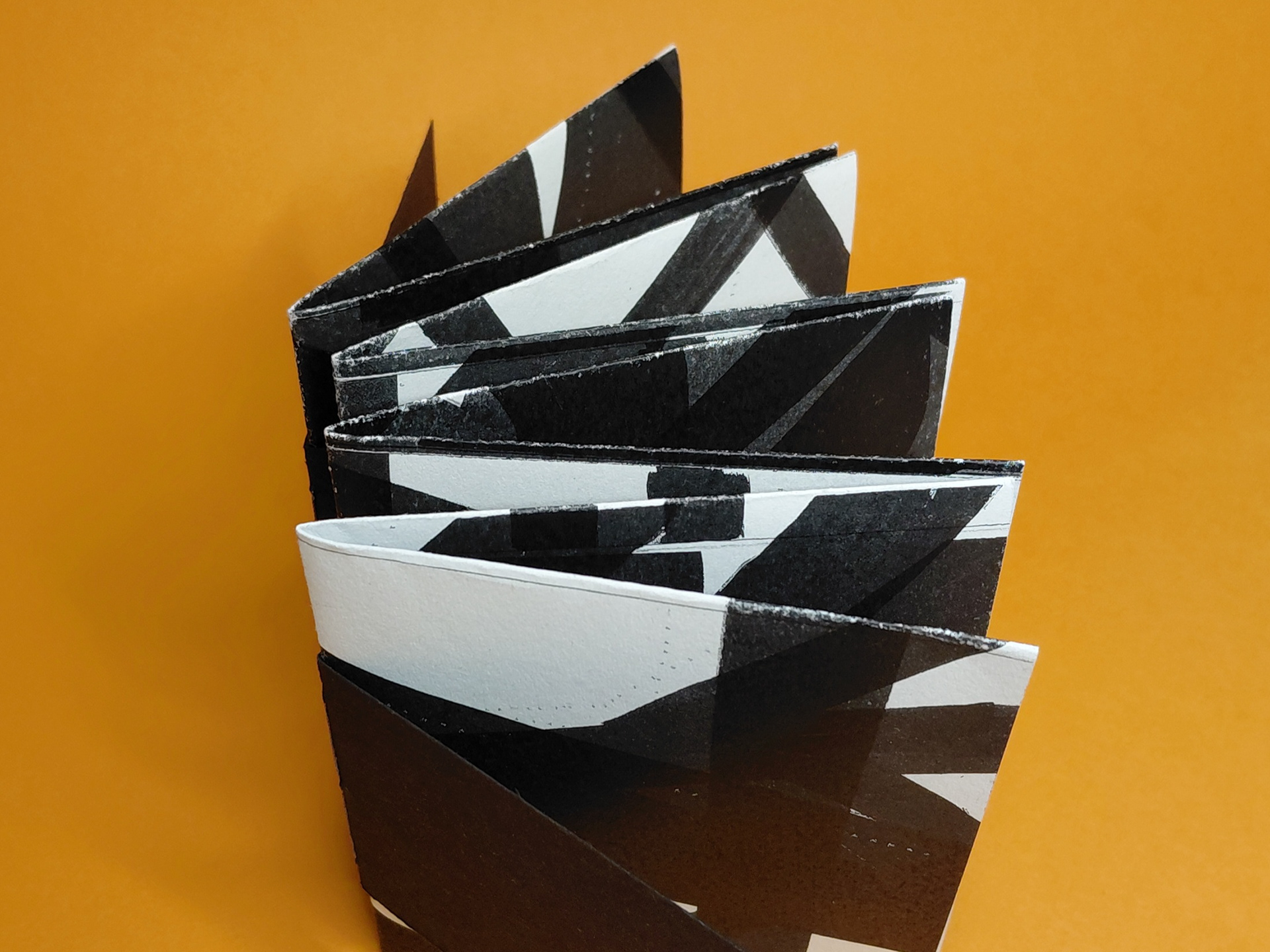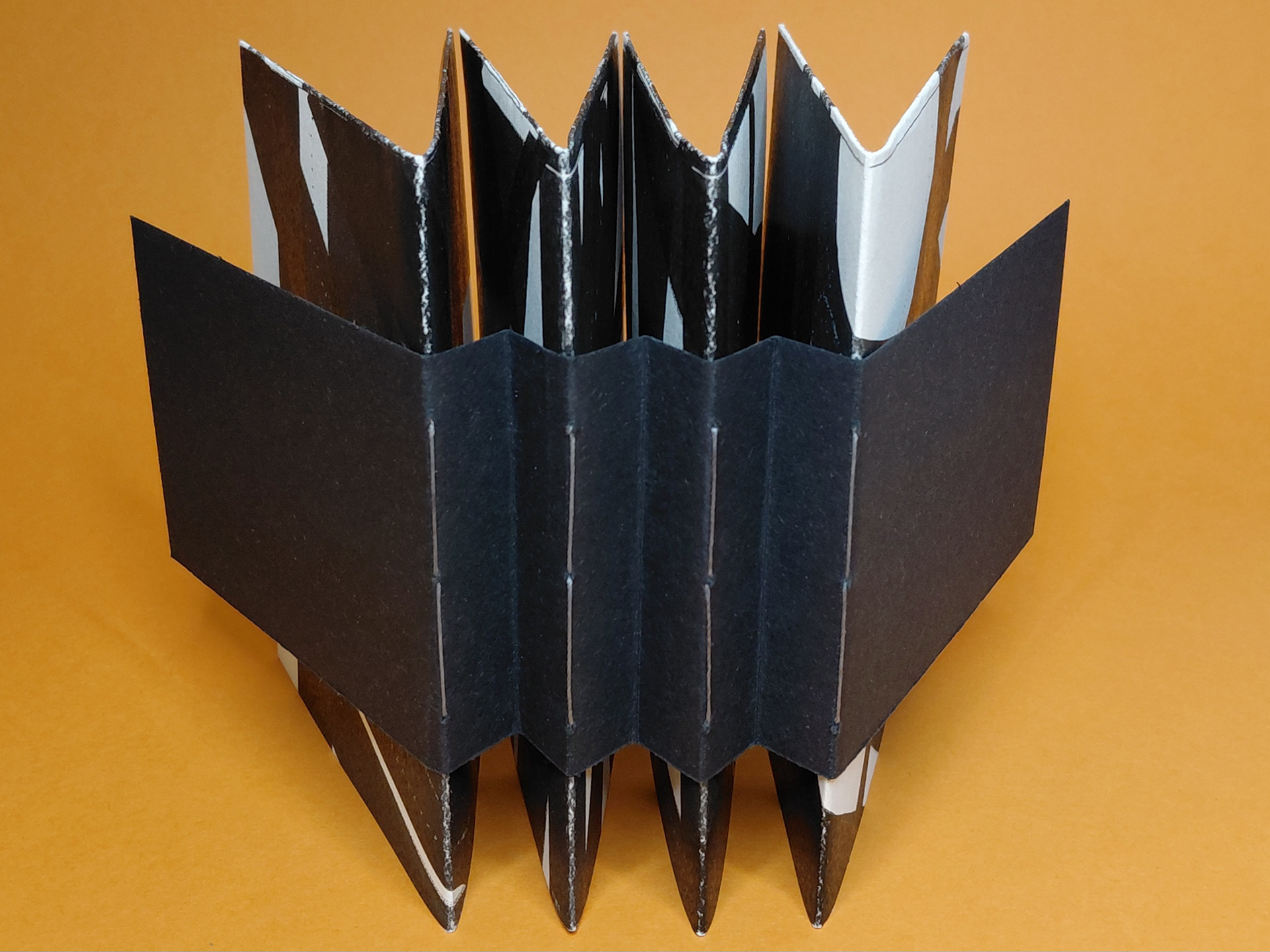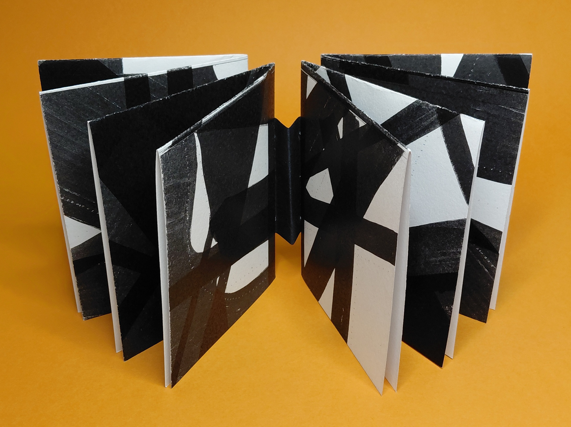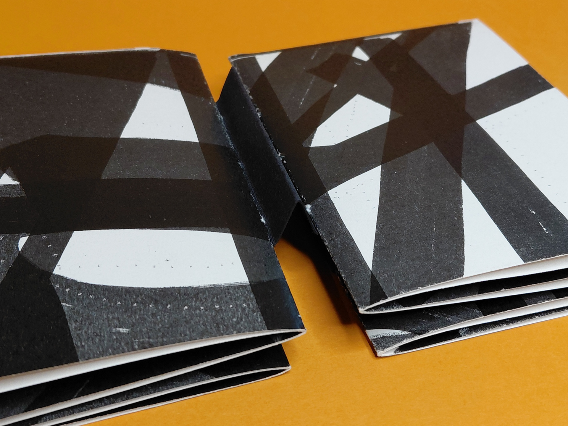 Photocopied motifs layered in successive passes to build density and compress visual rhythm. Each section is formed from folded quartos, their physical build echoing the visual weight of the page content.