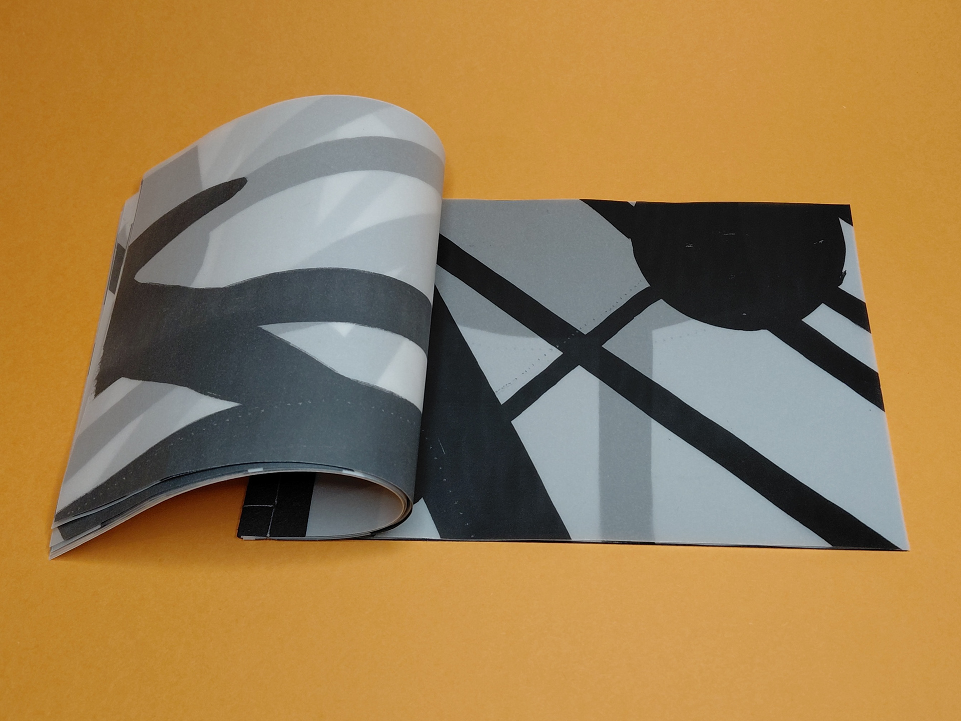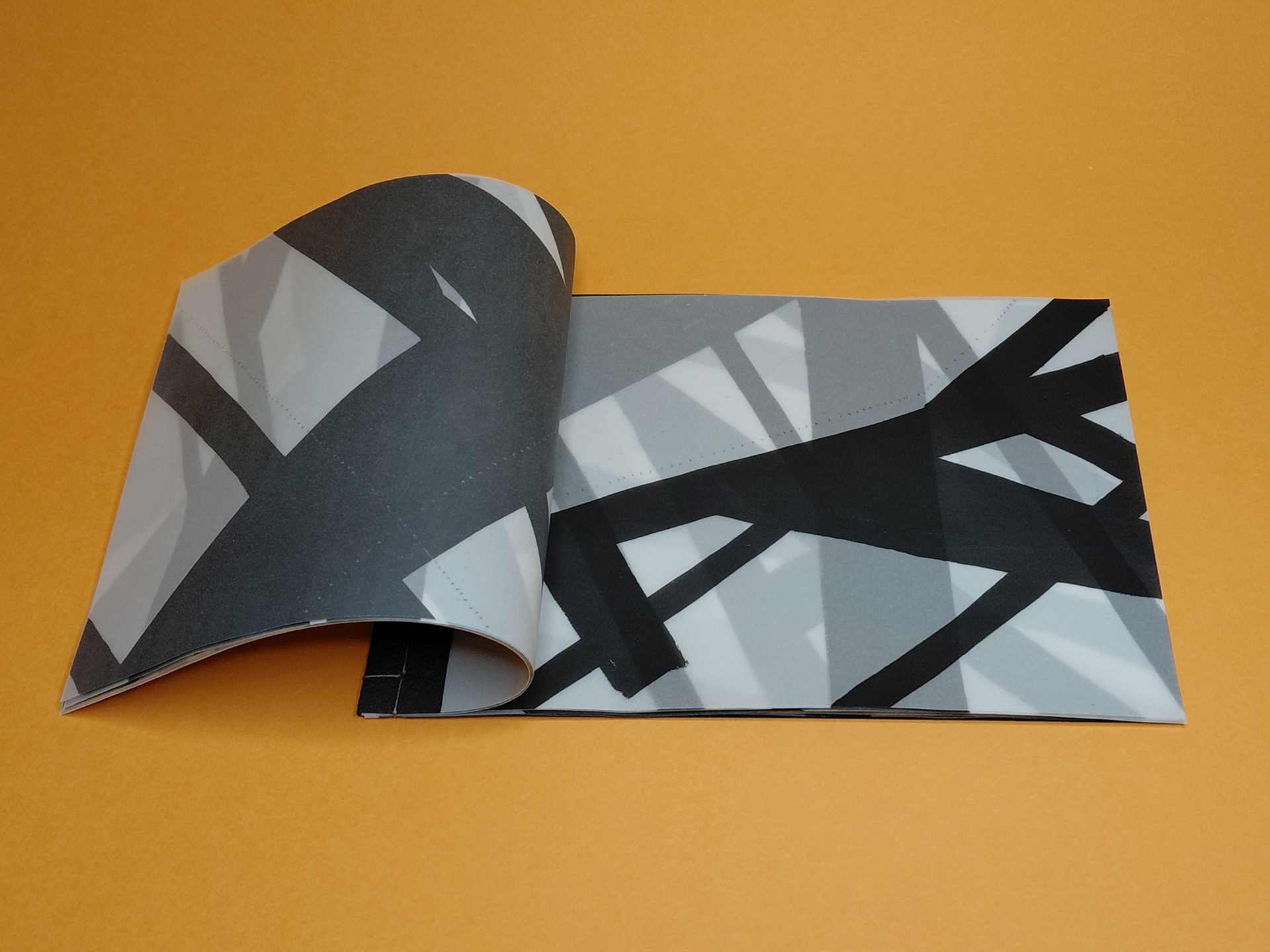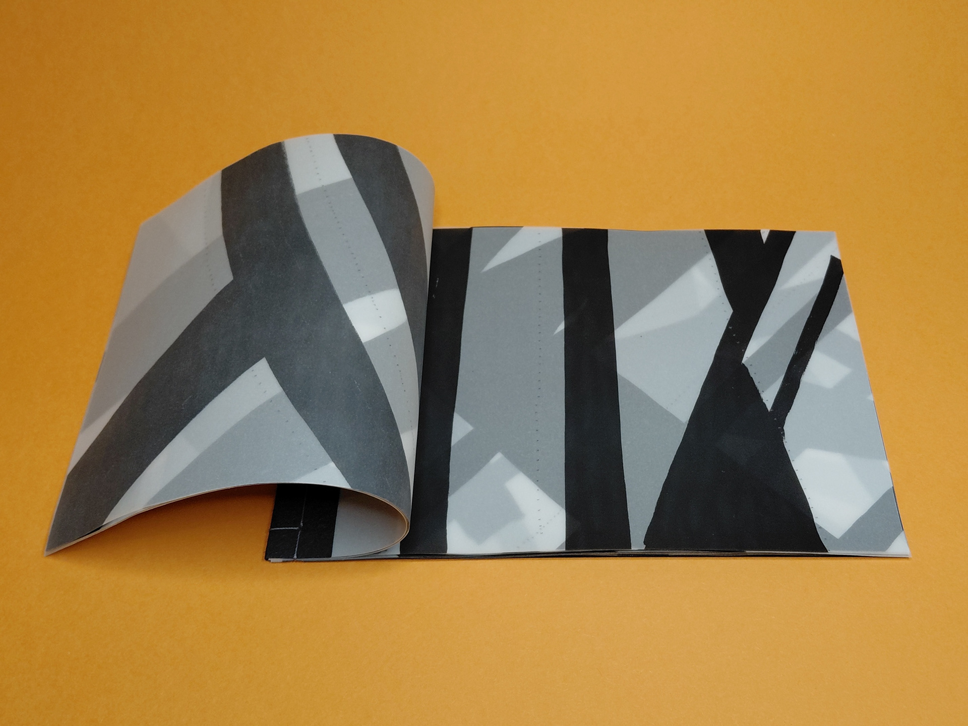 Photocopied shadow motifs on tracing paper, layered to explore translucency and depth. As pages build, the material lightens the negative space, revealing shifting alignments and new spatial relationships between forms.