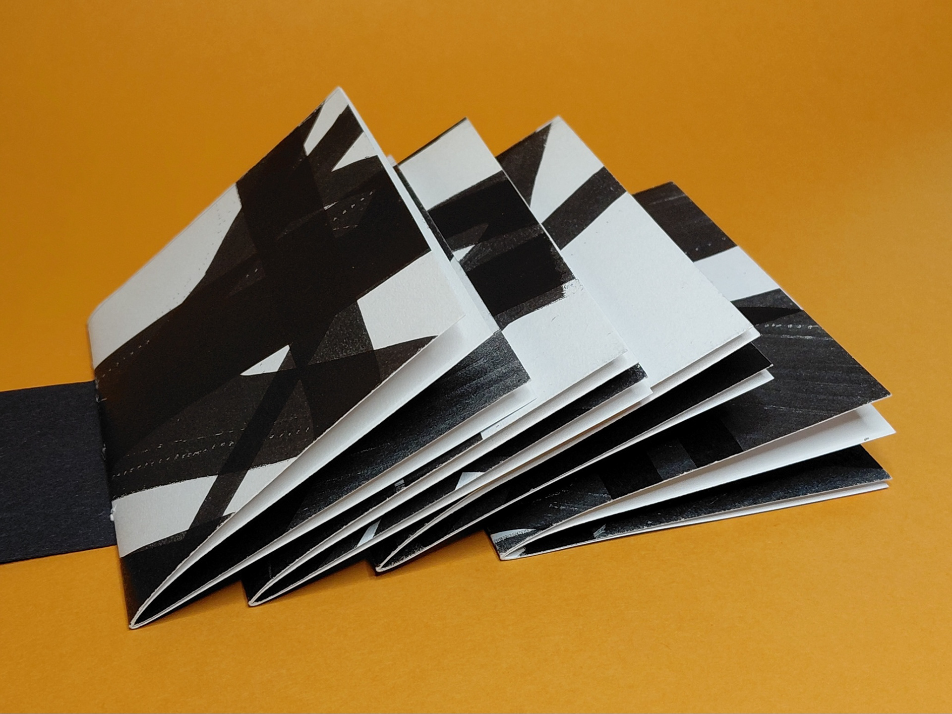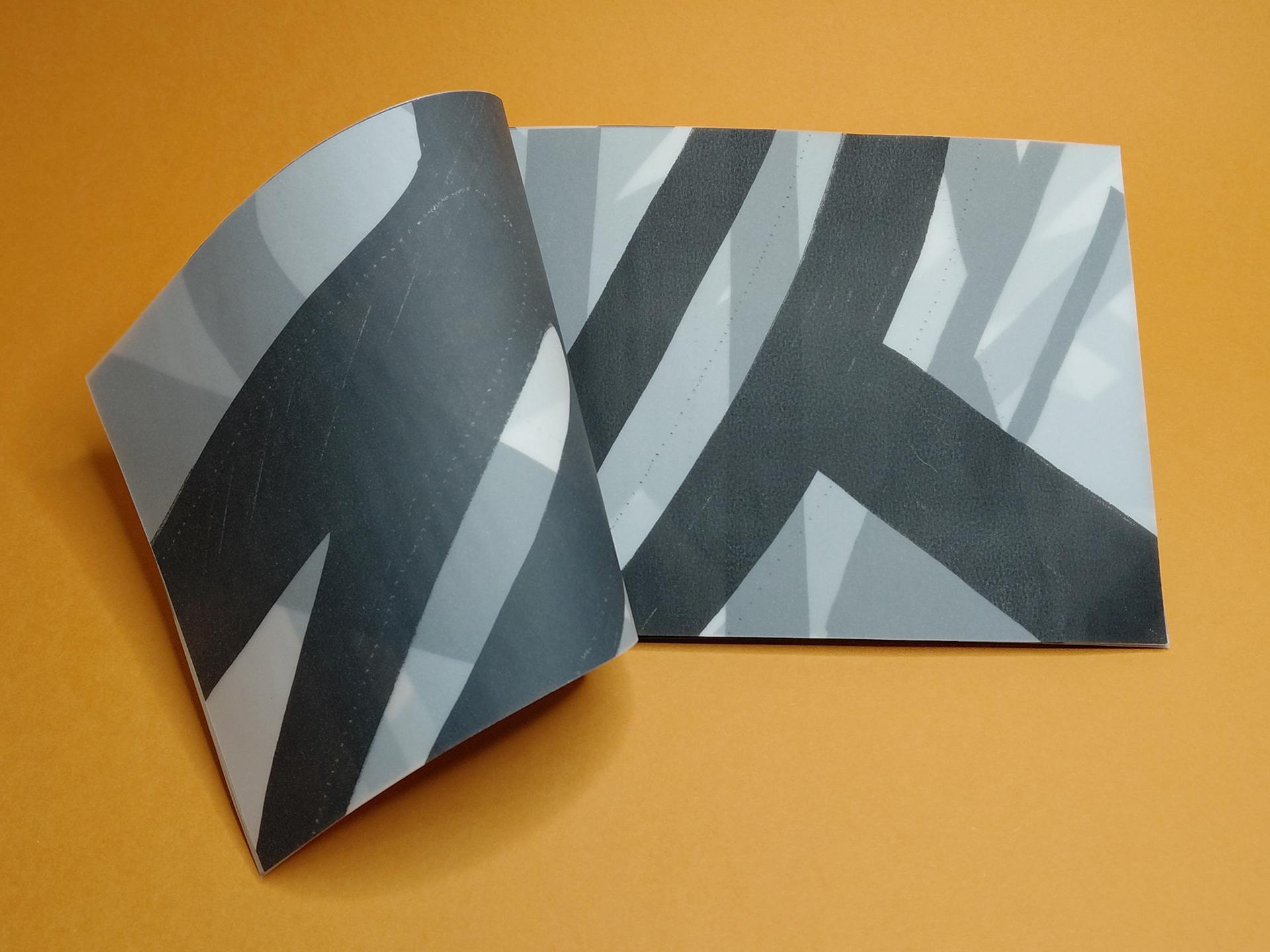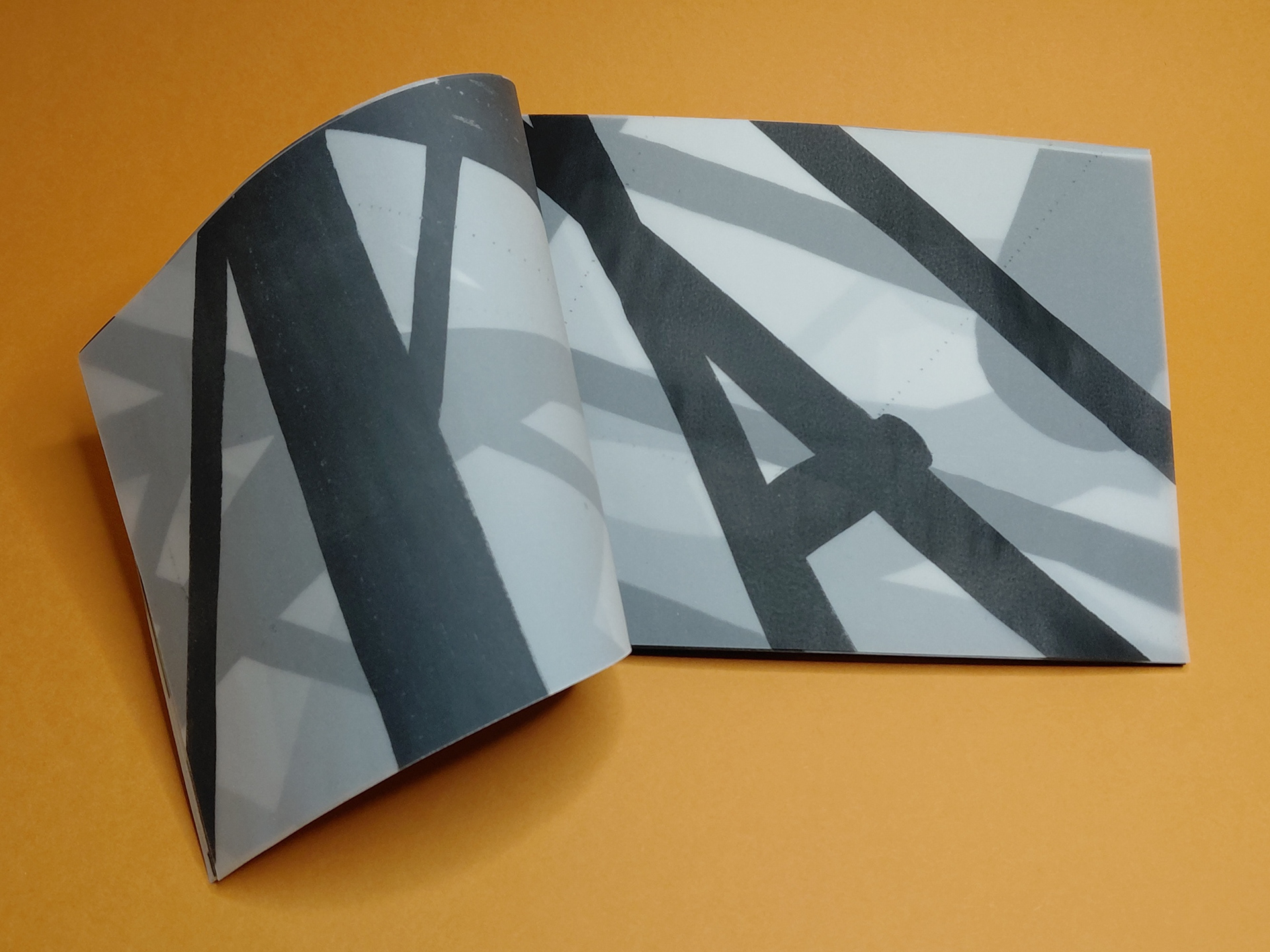 Photocopied shadow motifs on tracing paper, layered to explore translucency and depth. As pages build, the material lightens the negative space, revealing shifting alignments and new spatial relationships between forms.